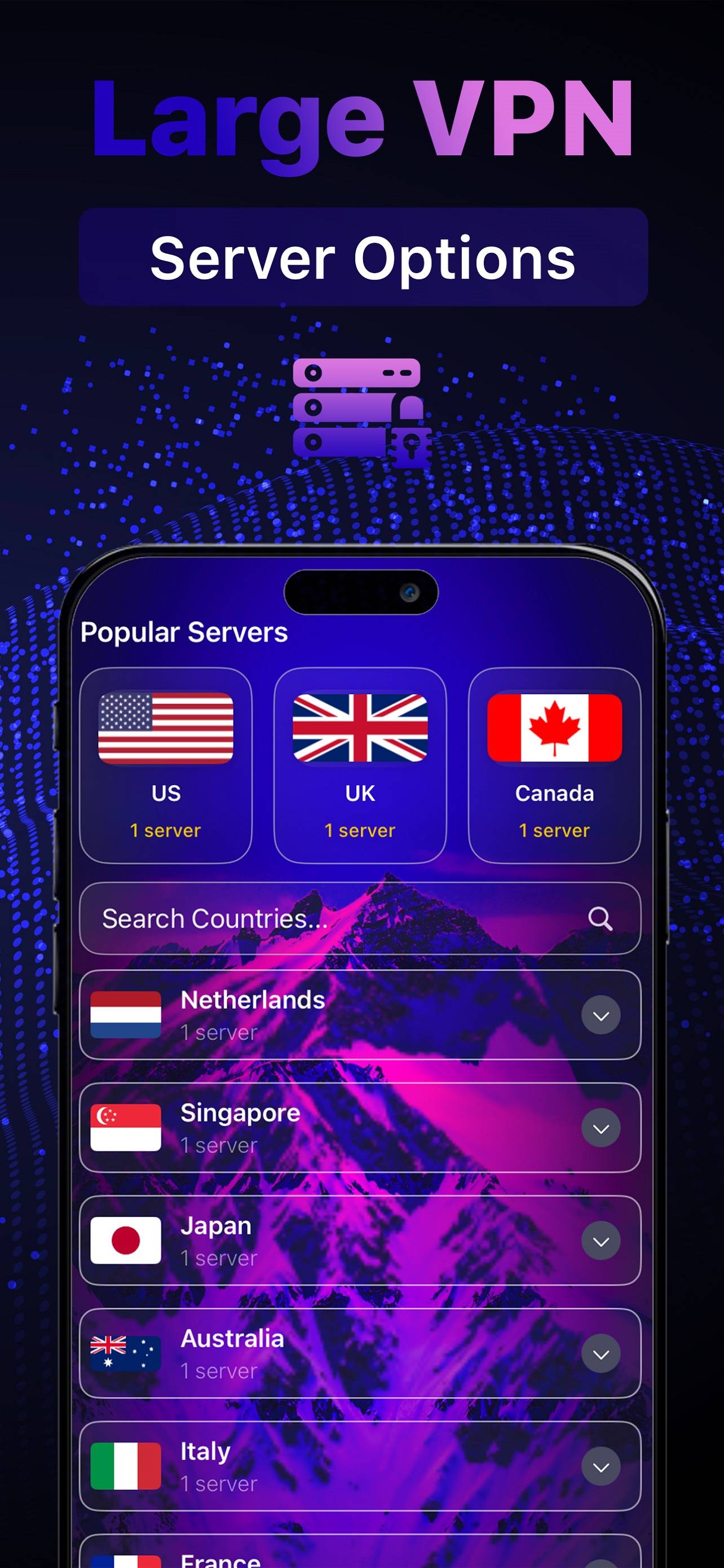 Access content from around the globe with a wide selection of servers, including the USA, UK, Canada, Singapore, Germany, France, and more. Unlock websites, streaming platforms, and apps safely and seamlessly.